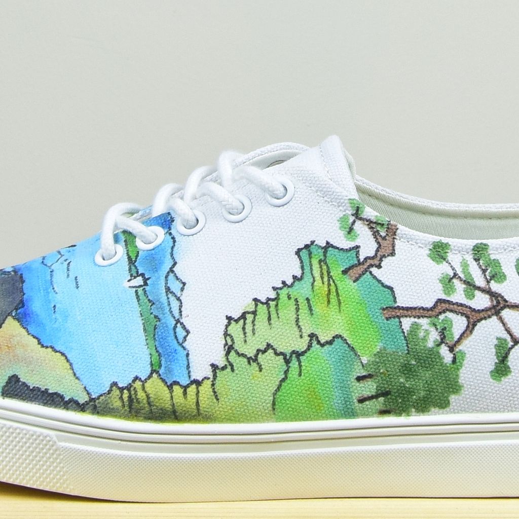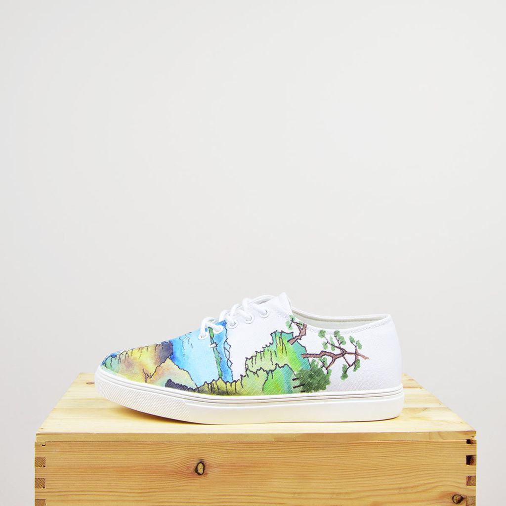 We use fabric paint, so that the colour sinks into the canvas (acrylic may work but might crack or peel). A layer of varnish will be applied to protect the shoes.